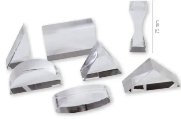 Linser og prismer i 7 ulike former, med størrelser fra 38 til 75 mm.