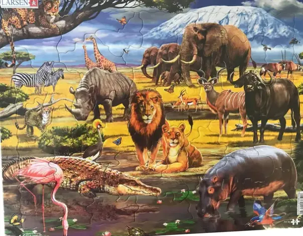 Puslespillet er komplett med sine 43 brikker, perfekt for unge barn. Noen av brikkene er formet som en krokodille, et nesehorn, en sommerfugl, en elefant, en løve, og en flodhest, som vil hjelpe barna med å gjenkjenne dyrene når de ser på formen. Artene på savannen er en prikkete leopard, solkyssende sjiraffer, elefanter, en stork, to oryxantiloper, stripete sebraer, nesehorn, buffaloer, en gepard, et par thomsongaseller, en kudu, en gråkrontrane, en nydelig rosa flamingo, en lur krokodille, en skilpadde, en isfugl, og så må vi ikke glemme herskerne av savannen, nemlig løvene. Det skitne vannet som er avbildet i puslespillet holder dyrene nedkjølt og klare for deres daglige jakt, mens fuglene og sommerfuglene flyr høyt i sky.