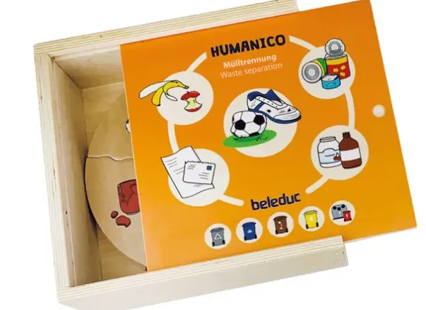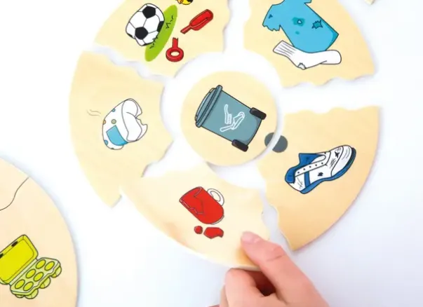 Fem puslespillbrikker får plass rundt den tilsvarende søppelkassen. Konturen til brikkene gjør det enkelt for barn å kontrollere seg selv. Følger med treboks for oppbevaring.