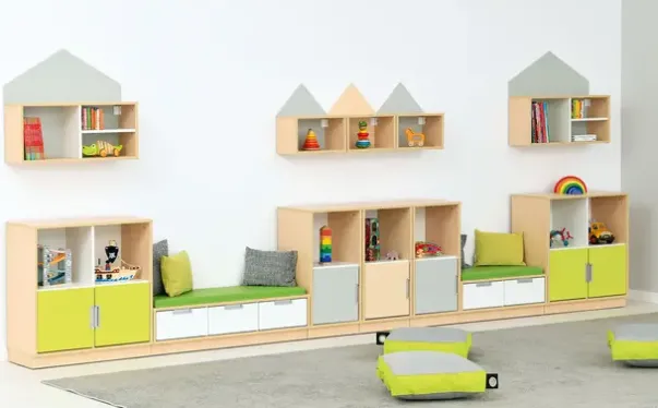 Materiale: Møbelspon 18 mm, laminat lys lønn og hvit farge, MDF