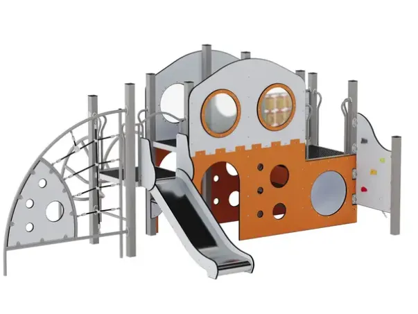 Materiale: Kvadratiske stolper (90 x 90 mm) av galvanisert og pulverlakkert S235 stål, sikkerhetselementer av HDPE (15 mm), plattform med antiskli, sklie av rustfritt stål, stålforsterket tau av polypropylen (16 mm), UV- og værbestandige fester og beslag