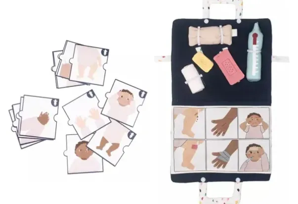 Oppmuntre barna til å identifisere kroppslige opplevelser ved hjelp av Rubens Baby kroppsbevissthet tilbehør. Å kommunisere smerte og andre opplevelser krever språkkunnskaper – verbalt og ikke-verbalt. Rollelek er en fin måte å støtte barn i å øve og utvikle kommunikasjonsevner slik at de gradvis kan tas i bruk i hverdagen. Å kommunisere smerte er spesielt komplekst siden det krever evne til å kombinere tanker, følelser og sanser for å forstå situasjonen.