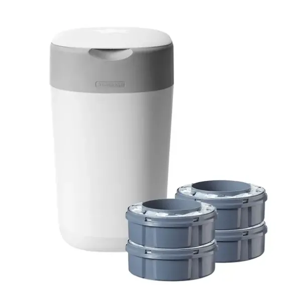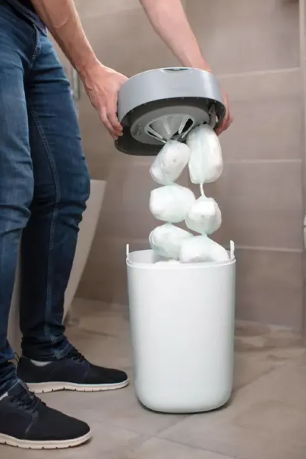 Bleiebøtten med flatt lokk slik at den kan stå intil en vegg. Unikt vri og klikk-system beskytter omgivelsene mot lukt og bakterier hver gang bleier kastes.