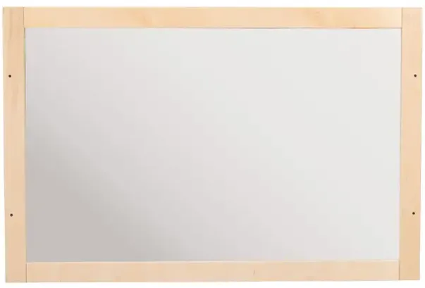 Speil med ramme i kryssfiner og sikkerhetsglass. Speilet har beskyttelse på baksiden for å hindre knusing. Speilet kan henges opp horisontalt eller vertikalt