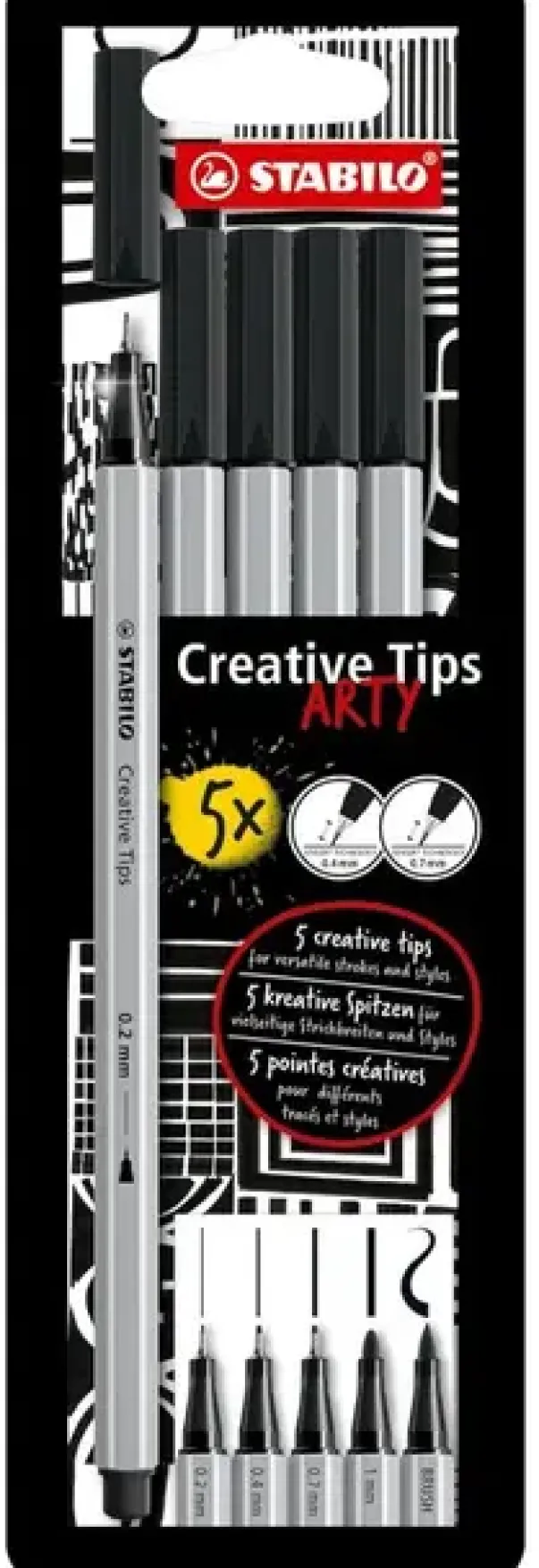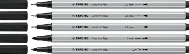 Det er fem forskjellige linjebredder fra 0,2 mm til 1 mm og en fleksibel penselspiss. Dette gir alle kunstnere den perfekte pennen, enten de skriver eller skisserer. Det vannbaserte blekket gjør det enkelt å skape flotte akvarelleffekter med bare litt vann og en pensel. Penselspissen kan brukes til både tynne linjer og bredere streker, avhengig av hvilket trykk du legger på.