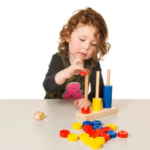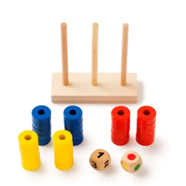 Innhold: Trestativ (L16.8 x B6.3 cm), 30 treringer, 1 tallterning, 1 fargeterning, instruksjoner, magnetisk oppbevaringsboks (L23 x B12 x H6 cm)