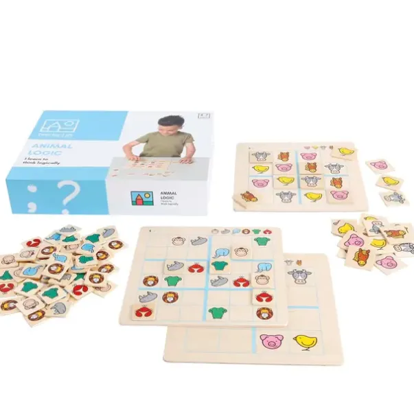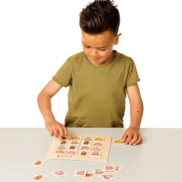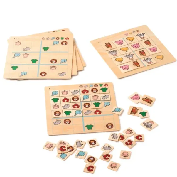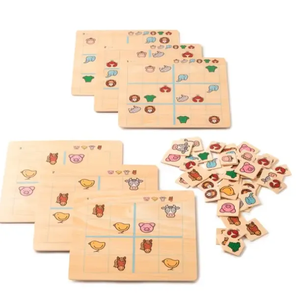 Innhold: 3 trebrett med 6 oppgaver (L22 x B22 cm), 24 trebrikker med dyr (L4 x B4 cm), 60 trebrikker med dyr (L3 x B3 cm), instruksjoner, magnetisk oppbevaringsboks (L31 x B23 x H6 cm)