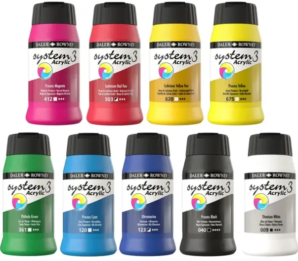 Daler-Rowney System3 Akryl er allsidige vannbaserte farger laget av pigmenter av høy kvalitet. System3 akrylfarger er lette, permanente, ugjennomsiktige (kan variere mellom farger), fleksible og tørker raskt, noe som gjør dem egnet for de fleste overflater både innendørs og utendørs.