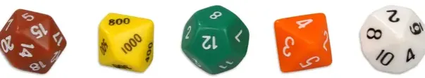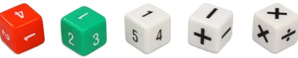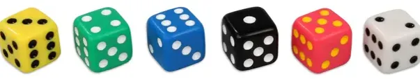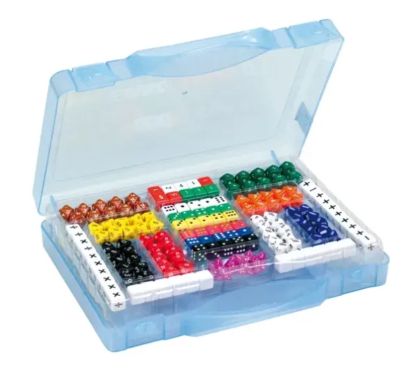 En hel koffert med terninger, tilsammen 162. Ulike farger, ulike former, med prikker, tall eller blanke.