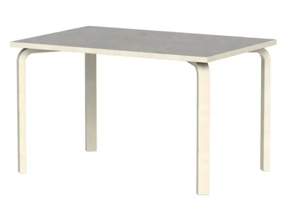 Bord med formspendte ben i heltre bjørk. Bordplate i støydempende linoleum.