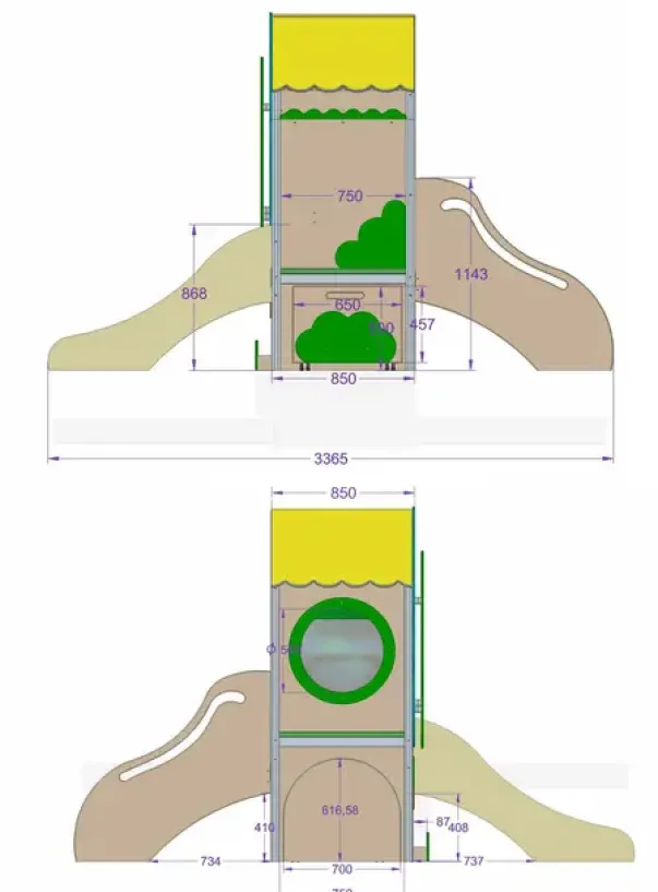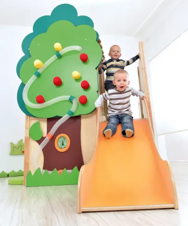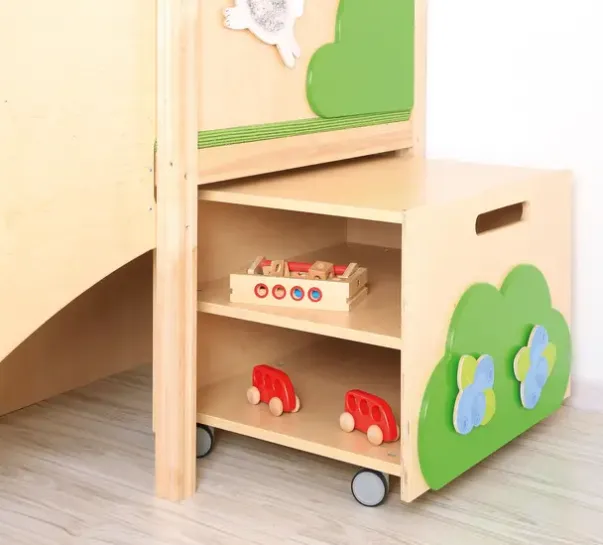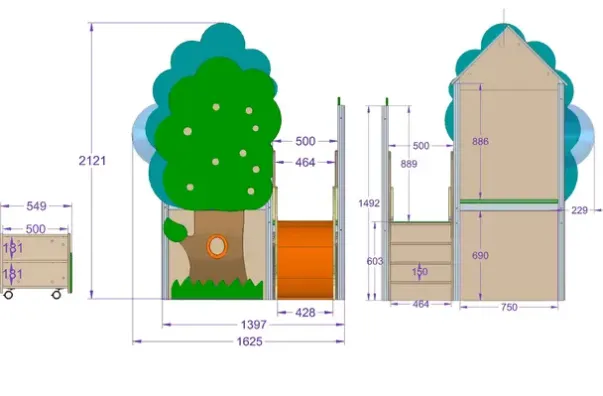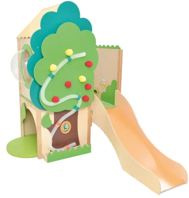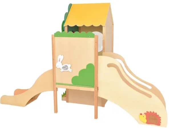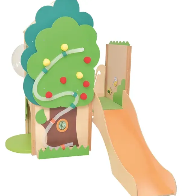 Lekehuset er dekorert med et tre, med «føle-frukter» og ball-bane. Huset har tak og ulike elementer til å ta og føle på. Under huset er det en hylle på hjul. Trappen har anti-skli. Total størrelse: L337 x B164 x H212cm. Hus: L140 (163 inkl kuppel) x B85 x H212cmTrapp: L117 x B50 x H114cm. Sklie L134 x B46 x H87cm. Plattformhøyder: 59 og 78cm. Madrass 116,5 x 77 x 5cm. Lekekroken er laget av finer og fargerike MDF-plater.