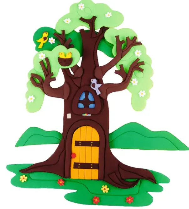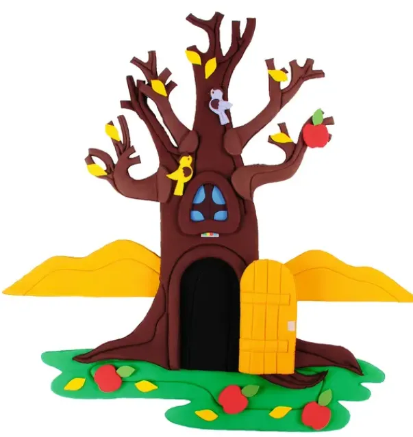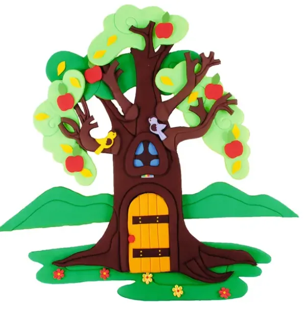 Veggdekorasjon epletre i 4 årstider. Laget av skum og dekket med stoff. Størrelse 130 x 80 cm. 39 deler som kan flyttes.