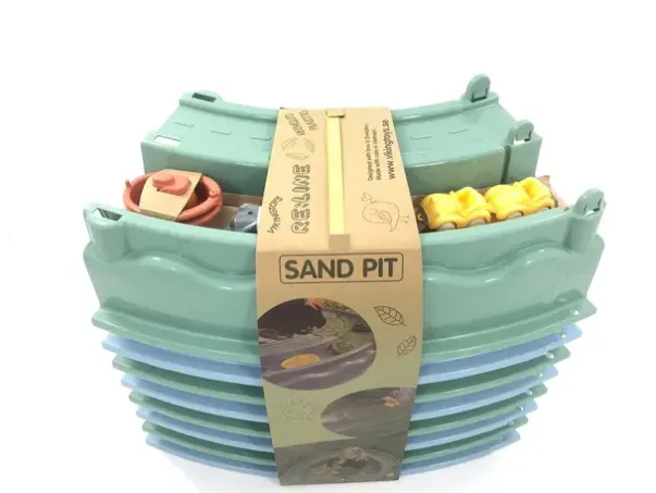 Sandkassen kommer som 8 deler som klikkes sammen og enkelt kan tas fra hverandre igjen for lettere oppbevaing.