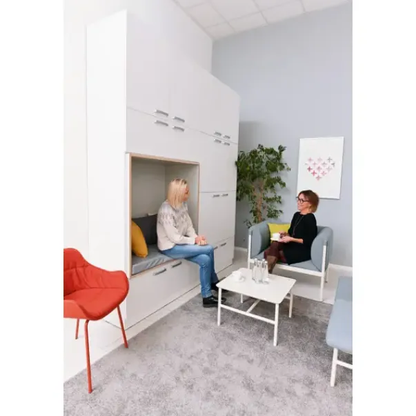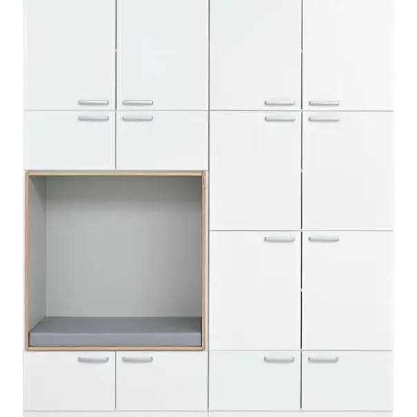Oppbevaringsmodul utført i 18 mm direktelaminert møbelspon. Lesehule i høytrykkslaminert kryssfiner. Lesehulen leveres inkludert sittemadrass i skum med trekk i slitesterkt kunstskinn. Rom bak de største dørene leveres med 1 stk. flyttbar hylle.