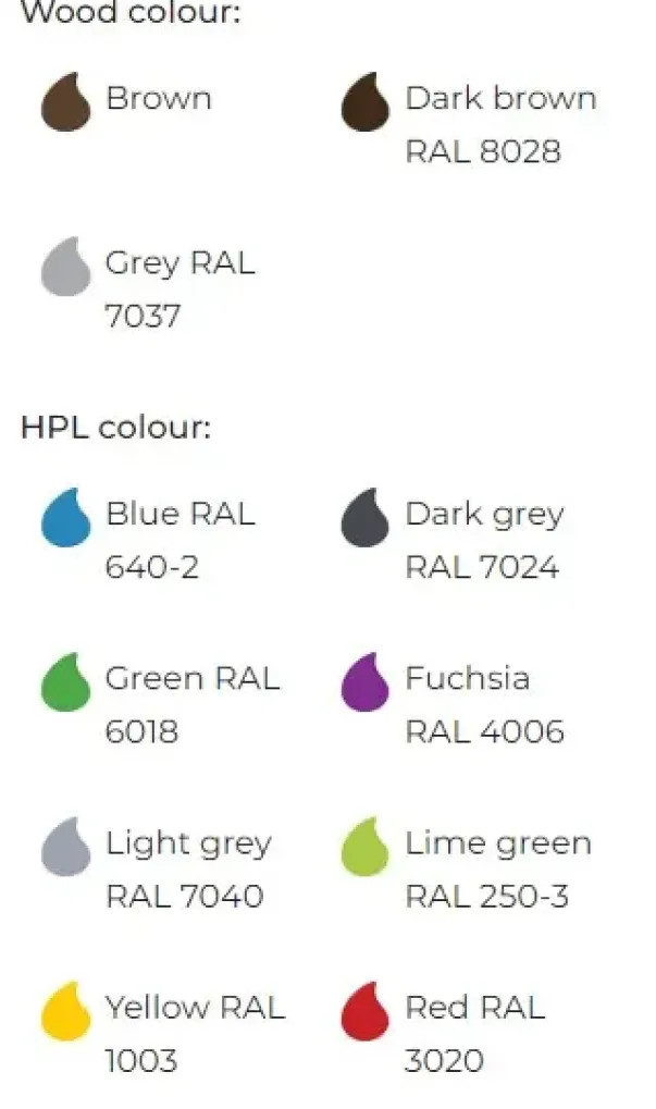 Materiale: HPL plater, plastikk-rør og galvaniserte stålføtter
