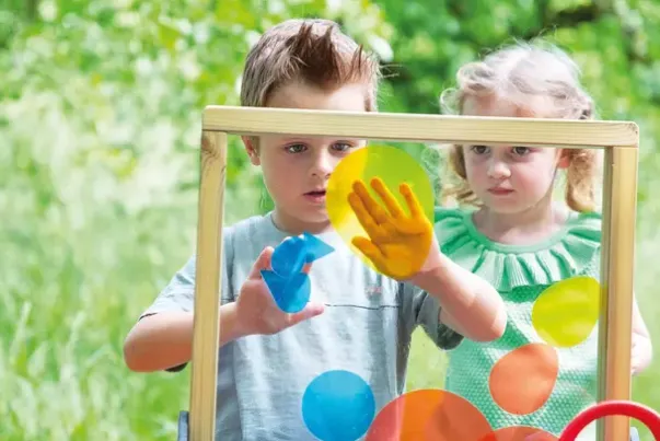 Spillebrettet med «maleramme» som du kan male f.eks med fingermaling eller gjørme på. Vindusbilder som kan brukes i hagen. Hvis to barn sitter overfor hverandre, kan de prøve å fargelegge konturene. Det er ingen grenser for kreativitet!
