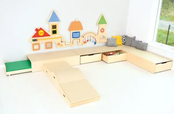 Lekepodie buet/konveks i kryssfiner og støydempende linoleum på toppen.