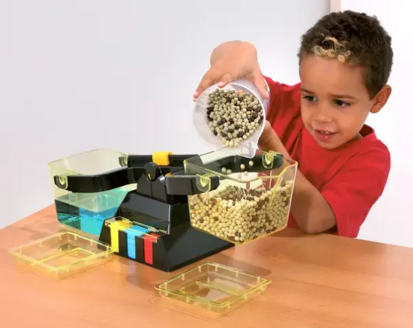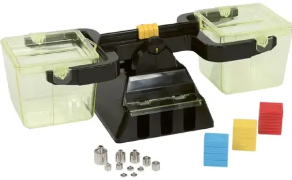Med vekten kan man veie alt opp til 1 kg og lære å sammenlikne forholdet mellom volum og vekt. Inneholder 11 lodd i metall og 14 lodd i plast, i tillegg til selve vekten.