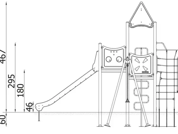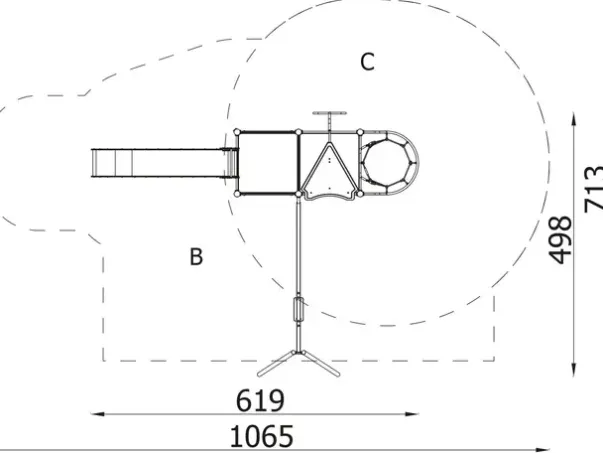 Barnas klatreborg 5. Størrelse 629 x 476 cm Sikkerhetsareal: 1045 x 655 cm. Fallhøyde 262 cm