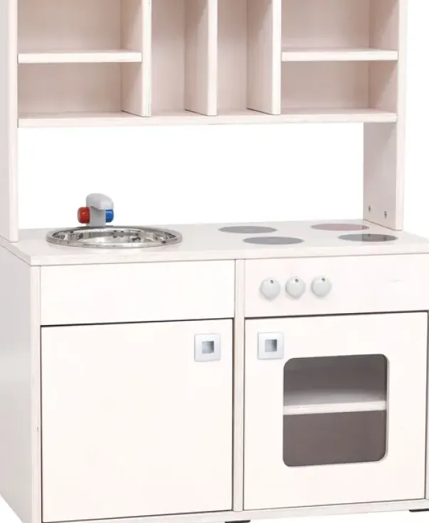 Lekekjøkken utført i 18 mm tykk hvitpigmentert kryssfiner av bjerk. Kjøkkenet leveres i to modeller, med og uten sokkel. Oppvaskkum kan tas ut av benken. Alle knotter kan skrus på. Skapdører med håndtak i aluminium med avrundede hjørner. Med hylle over kjøkkenet med god plass til utstyr og mat.