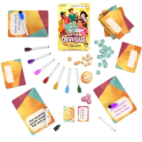 To play, reveal the round’s current word and sentence length. In secret, each player writes a sentence on their board, then passes their board to the next player, who removes one word — other than the current word — from the sentence. In turn, each player reads out their sentence while others try to guess what the missing word is.