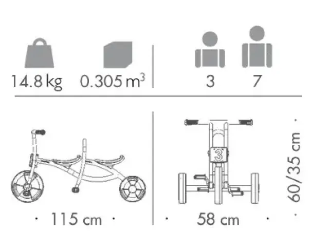 - Pedaler og eikeløse hjul laget av polypropylen med solid gummi