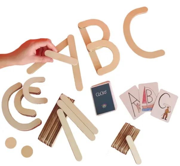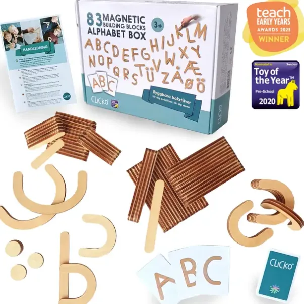 Trebiter som kan bygges sammen til bokstaver. Kortstokk med monstre og stjerner følger med slik at barna kan spille bokstavspillet. Trekk et kort og bygg bokstaven på kortet ved hjelp av tredeler. For hver bokstav får man en stjerne! Men pass på monstrene som elsker stjerner… Først til 5 stjerner vinner! Les mer>>