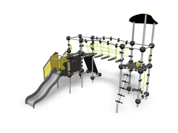 Materiale: Varmgalvanisert stål, stålforterket klatretau, HPL-plater og galvaniserte stålføtter