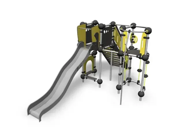 Materiale: Varmgalvanisert stål, stålforterket klatretau, HPL-plater og galvaniserte stålføtter