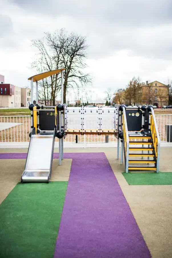 Materiale: Varmgalvanisert stål, stålforterket klatretau, HPL-plater og galvaniserte stålføtter