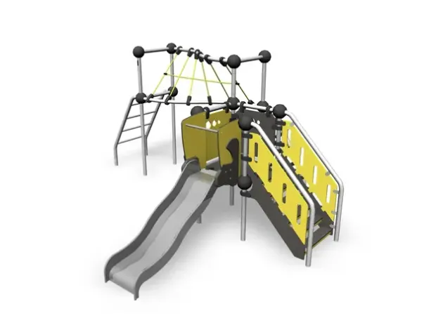 Materiale: Varmgalvanisert stål, stålforterket klatretau, HPL-plater og galvaniserte stålføtter