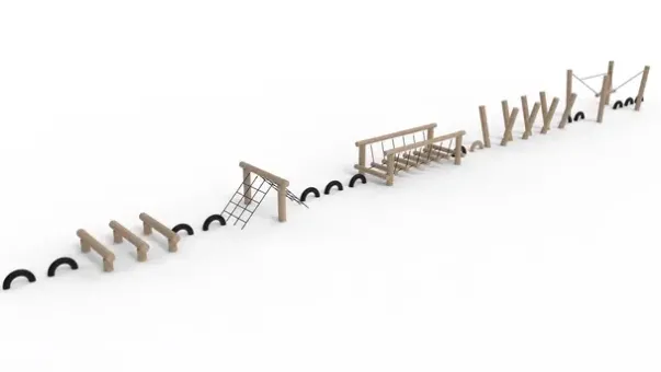 Består av: 1 bevegelig balansestokk, 4 par stylter, 1 balansebro, 1 klatrenett, 3 balansebommer og 14 dekk å balansere på og hoppe mellom.