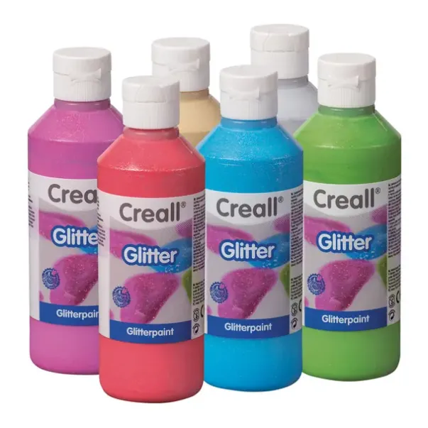 Halvtranspararent maling med glitter. Fester seg godt på papir,kartong, skumgummi og stein, den skinner også på mørke overflater. Fargene børikke tynnes ut med vann, da glittereffekten blir svakere.