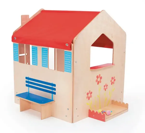 Hustaket som er av stoff, kan legges over «huset» som har 2 trekantete endevegger, og kneppes på plass.
