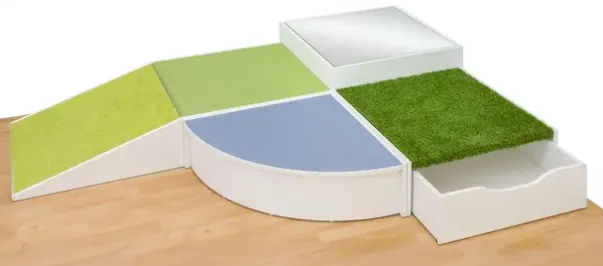 Educasa Anton podiesett inviter nysgjerrighetenog leken til ulike oppdagelser. De fem forskjellige podiene med de ulike overflatene gjør dette podiesettet til en oppdagelsesøy. Podie med speil vil fort bli en favoritt der barna kan speile både leker og seg selv. Takket være plattformen med skuff er småbiler, byggeklosser eller andre småting alltid godt oppbevart og innen kort rekkevidde.