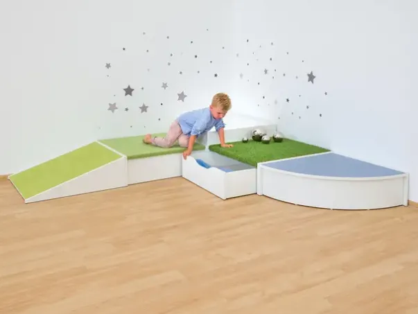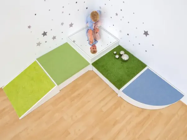 Med Anton podiesett oppmuntres alle sanser. Barnehagebarn er spesielt fascinert av plattformen med speil. De vil fort bli begeistret for å se sin egen refleksjon samt speiling av leker. Sokkelen med kunstgress har et ekte gressutseende og det oppleves som at du tar naturen inn i lekerommet. Rampen og kvartsirkelen er utstyrt med lettstelt linoleum som tørkes enkelt av og behandles med vanlige desinfeksjonsmidler.
