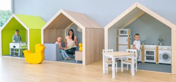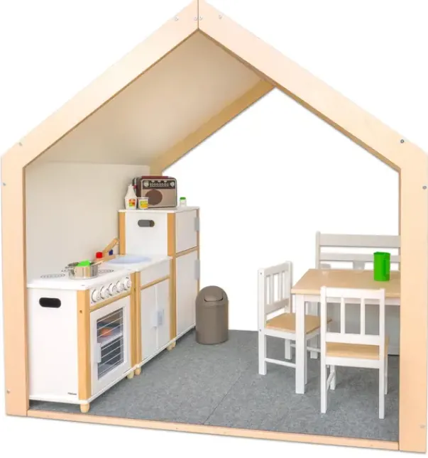 Huset er tilgjengelig fra to sider og har en takhøyde som gjør at voksne også kan oppholde seg i huset. Dette kan bli til et dukkehus, musikkrom, eller et malehus – her er det kun fantasien som setter grenser! Det barnevennlige designet passer godt sammen med et hvert interiør. Gulvet i huset er dekket av et slitesterkt, lettstelt og lyddempende teppe.
