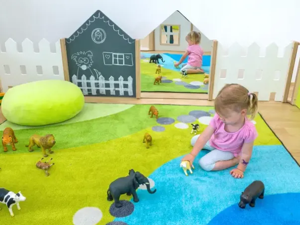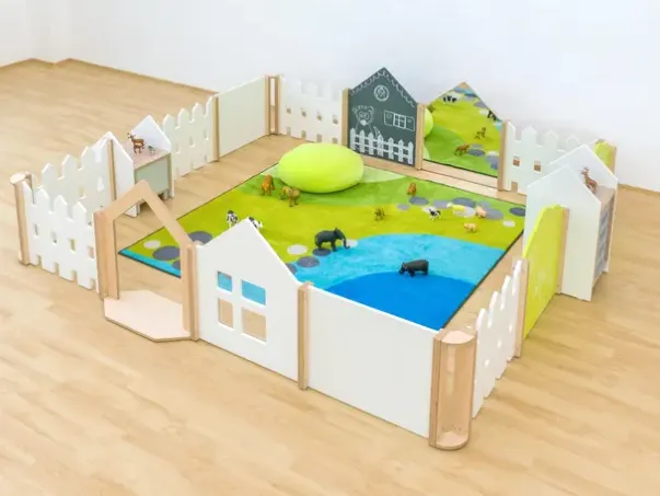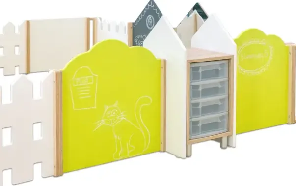 Educasa lekepark består av 31 elementer som stimulerer fantasien, lekegleden og oppfordrer til utforskning. Elementer som tavle, speil og vindu er noe av det barna kan utforske i lekeparken. De integrerte hyllene med praktiske skuffer gir ekstra lagringsplass for leker, penner, kritt og andre gjenstander.