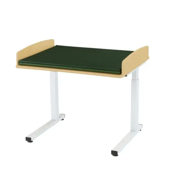 Elektrisk hev/senk stellebord, der arbeidshøyden enkelt justeres med en håndkontroll. Alle hjørner og kanter er avrundet, og stellebordet leveres komplett med madrass og høye sidekanter.
