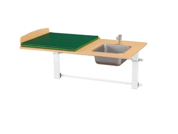 Ella er en serie med elekstrisk heve og senk funksjon hvor man enkelt kan tilpasse arbeidshøyden etter behov. Justeringen fungerer enkelt med en håndkontroll med spiralkabel. Med styreenheten senkes lett stellebordet slik at barn kan klatre opp på stellebordet uten å løftes. Når det er gjort kan du raskt og enkelt stille inn den arbeidshøyden du ønsker. Med avrundede hjørner på sidevanger og bordplaten. Stellebordet leveres komplett inkludert stellepute, vask i rustrfritt stål, ett-greps blandebatteri og avløpsdetaljer