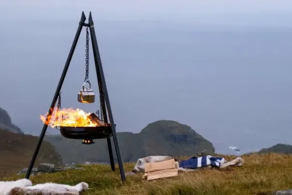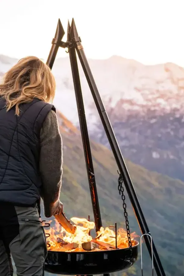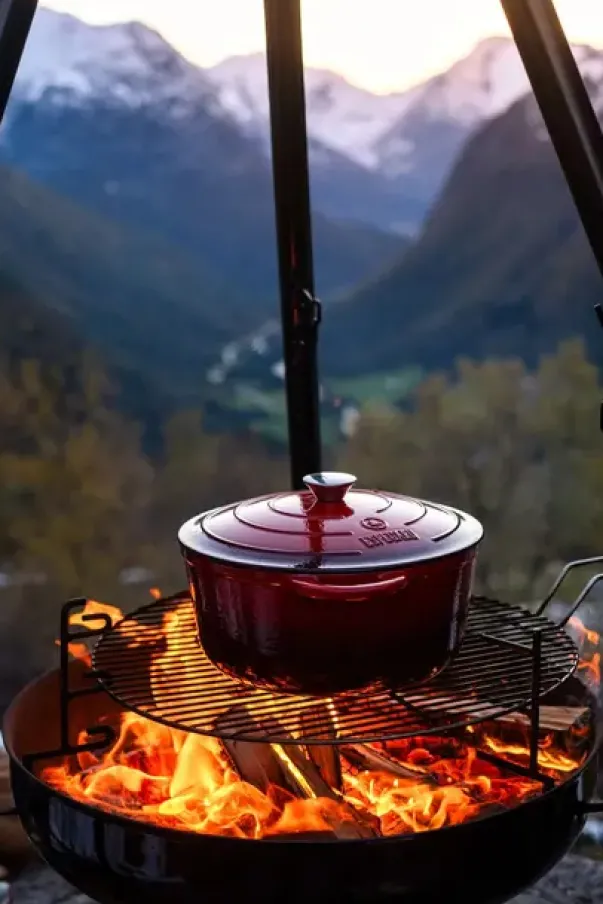 - Bålpanne i emaljert stål med senterhull i bunnen og bålbooster med glosamler som monteres gjennom hullet
