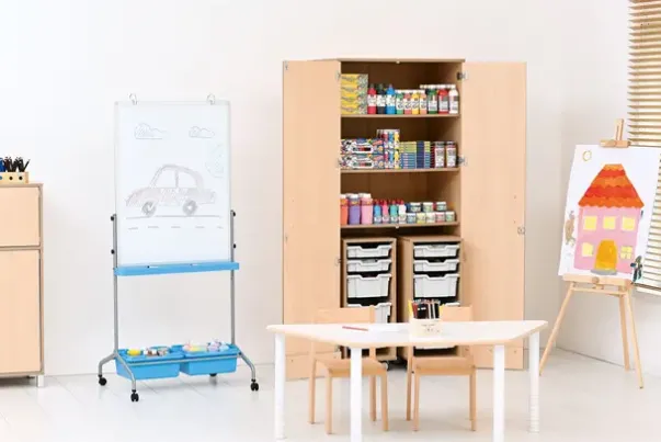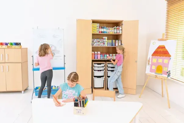 Materiale: 18 mm tykk møbelspon med direktelaminat i bjørk farge, ABS kantlist, plastkasser