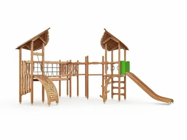 Funksjoner: Aktivitetsapparat med to leketårn, sklie, klatrerampe, klatrevegg, trinnbro