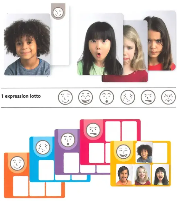 Fotokort med bilder av ulike ansiktsuttrykk, der barna kan gjenkjenne og beskrive følelser. Bildene kan sorteres i grupper etter symboler, glad, forskrekket, lei seg, sint osv. I tillegg kan en spille to ulike lottospill.