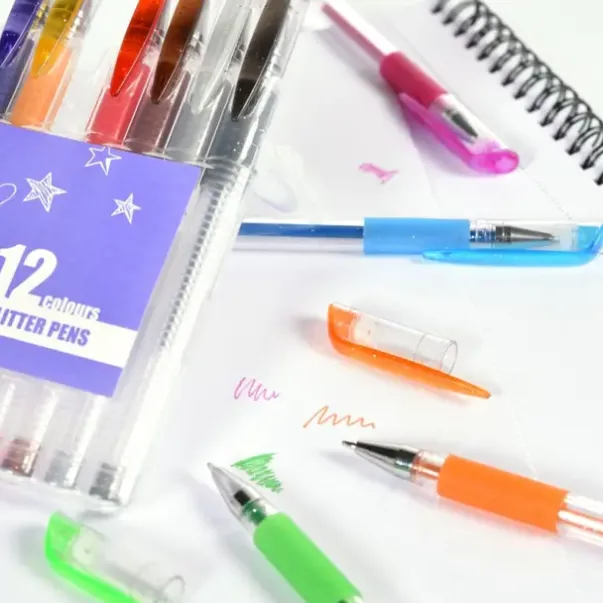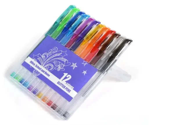 Glitterpenner med 1mm metallspiss i praktisk selvstående etui som gjør det enkelt å finne riktig farge. Det forhindrer også at pennene havner på gulvet og blir borte. Etuiet inneholder 12 flotte glitrende farger, som dekker godt og gir et flott resultat.