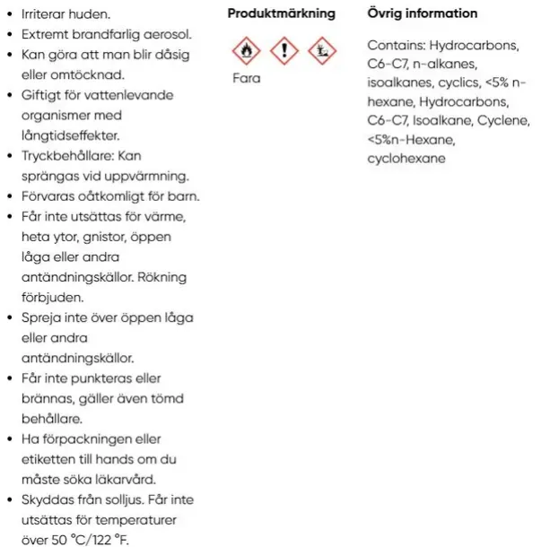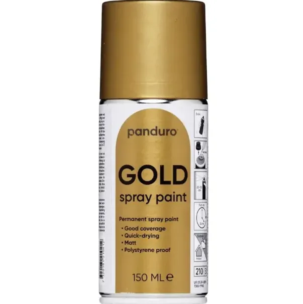 Løsemiddelbasert. Tips: Spray utendørs eller ha god ventilasjon inne. Flere tynne lag (istedenfor ett tykt) gir bedre resultat. La tørke mellom hvert lag. Avstand 20-30 cm. Boks med 150 ml.Gull