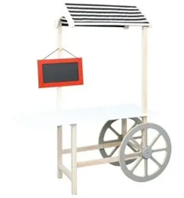 Koselig kafevogn utført i kryssfiner og lamoinert sponplate. Leveres komplett med stofftak og krittavle.