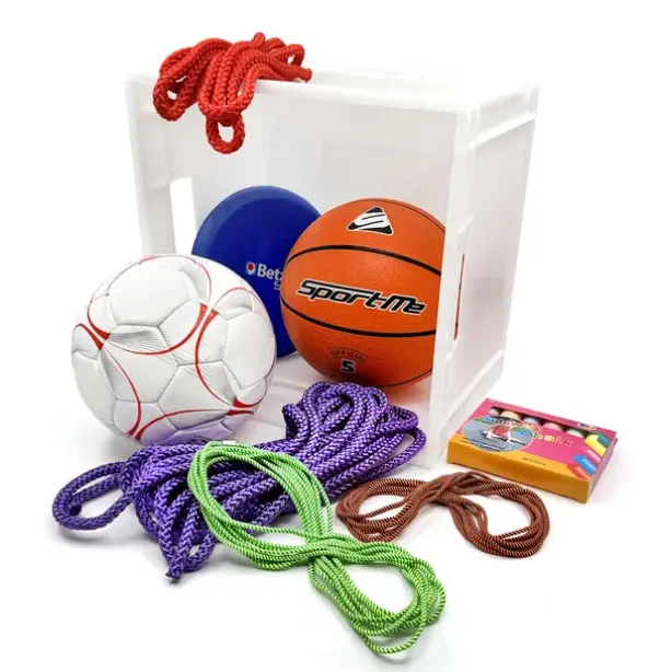 Settet inneholder: 1 stk fotball str 4, 1 stk basketball str 5, 1 stk frisbee, 2 stk hoppestrikk ,1 stk hoppetau og 1 stk slengtau, 6 stk kritt og 1 stk plastkasse for oppbevaring. Farger kan variere.
