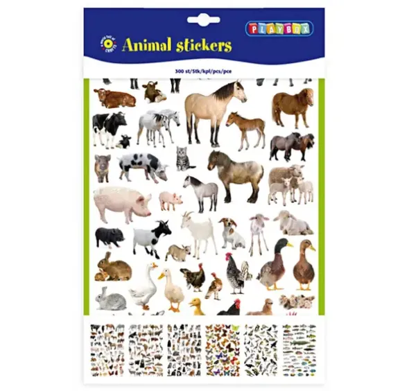 Klistremerker med ulike serier. Motiv med både husdyr, ville dyr, hunder og katter, sommerfugler, fugler og fisker.