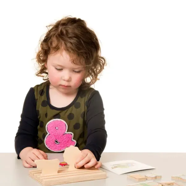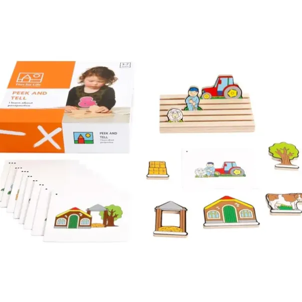 Innhold: Trestativ (L18 x B11 cm), 8 treobjekter, 9 oppgavekort (L13 x B11 cm), instruksjoner, magnetisk oppbevaringsboks (L23 x B21 x H6 cm)